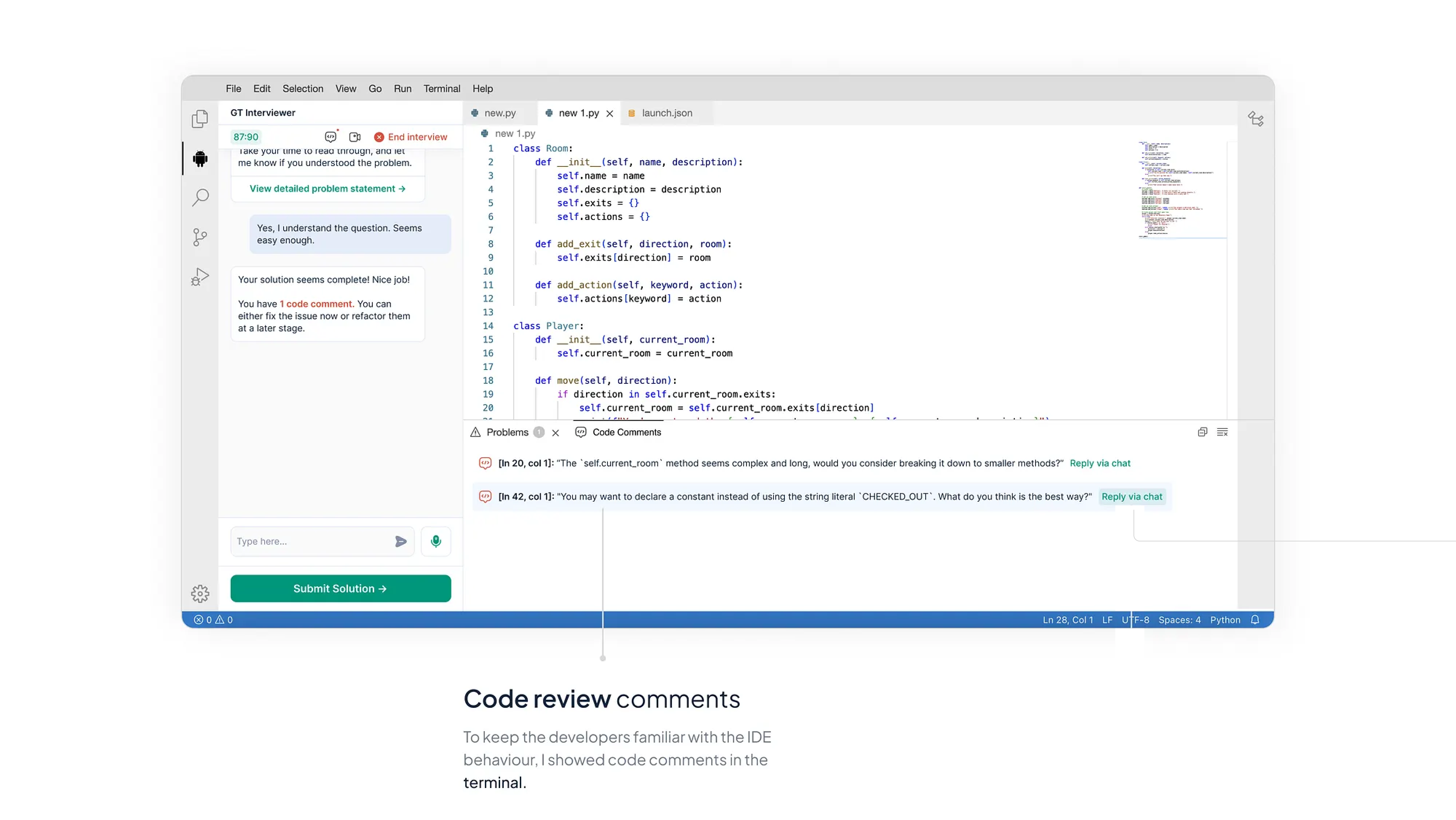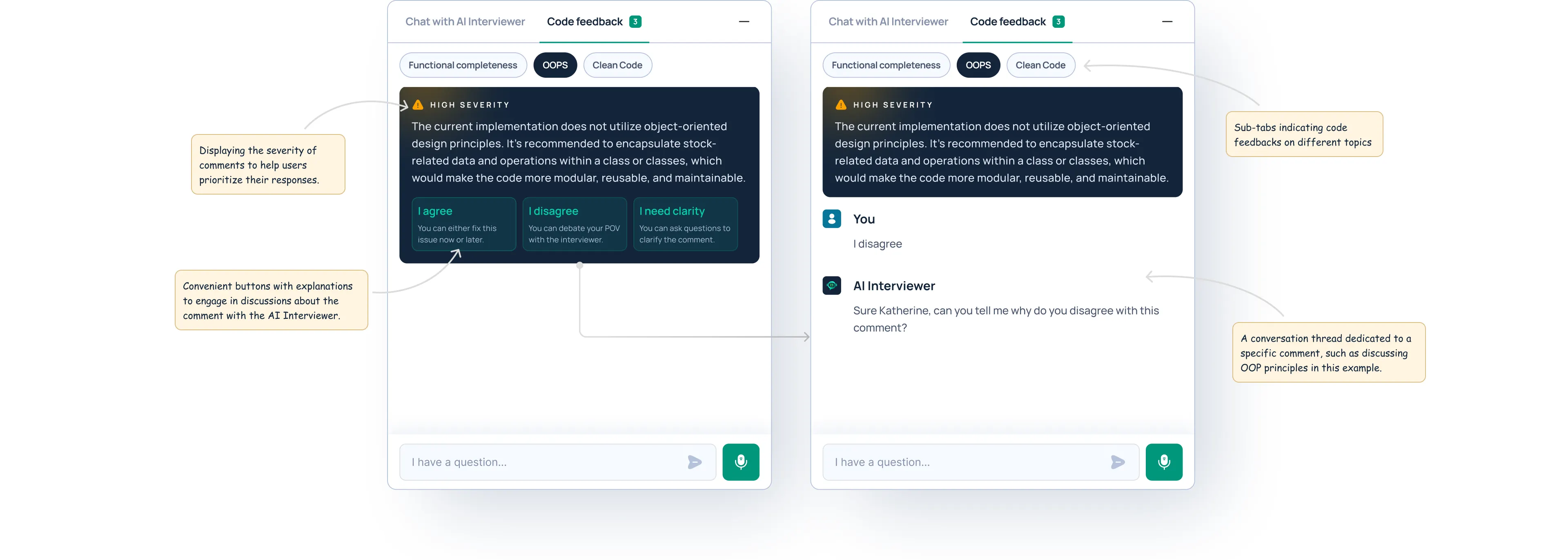 We decided to display code review comments within the chat interface alongside the AI Interviewer.