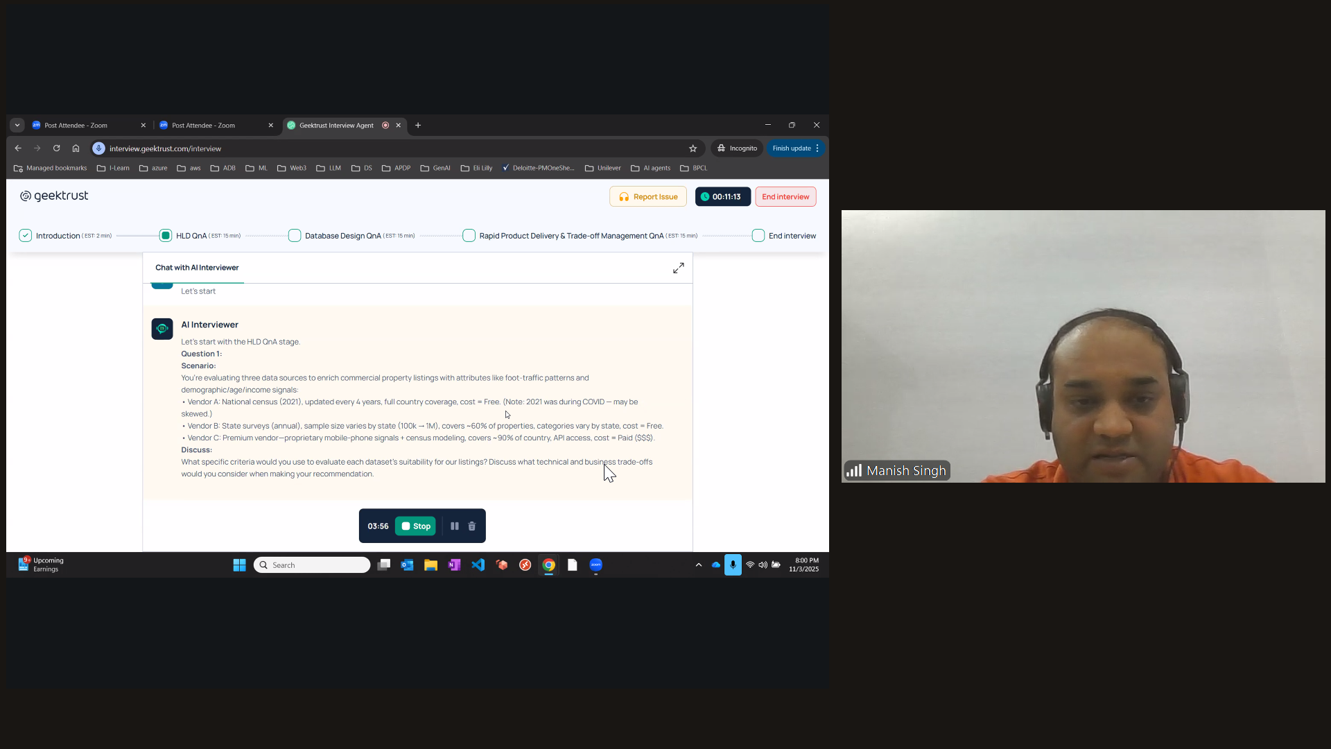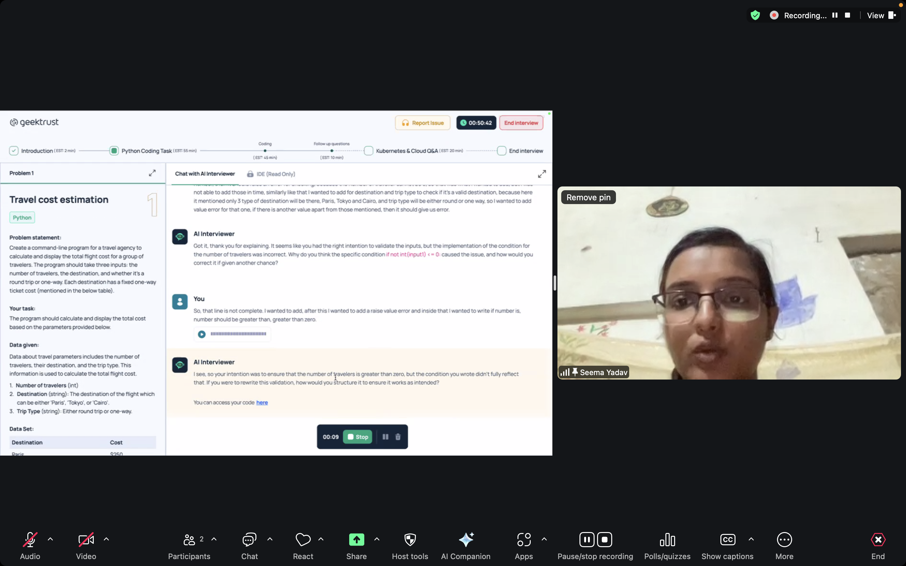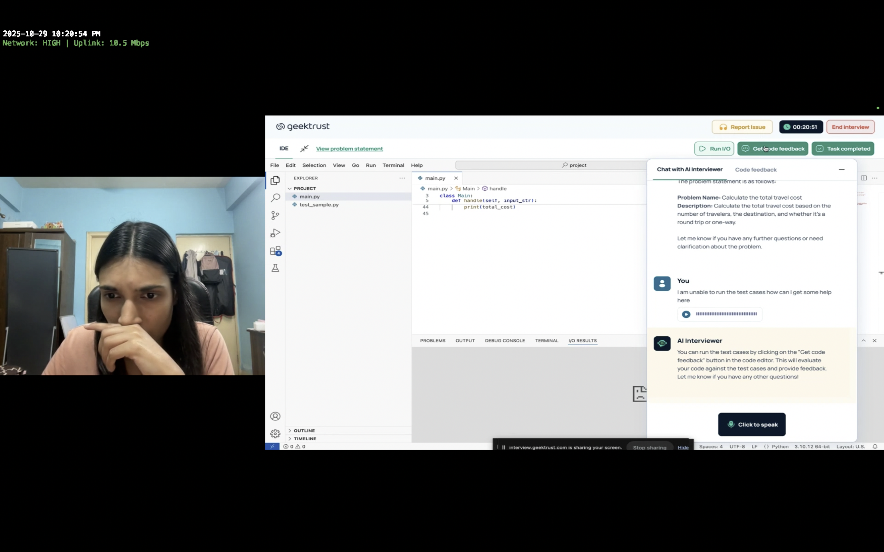 ✔ The user can read the detailed problem statement and ask any questions to the AI Interviewer on the right side of the screen.